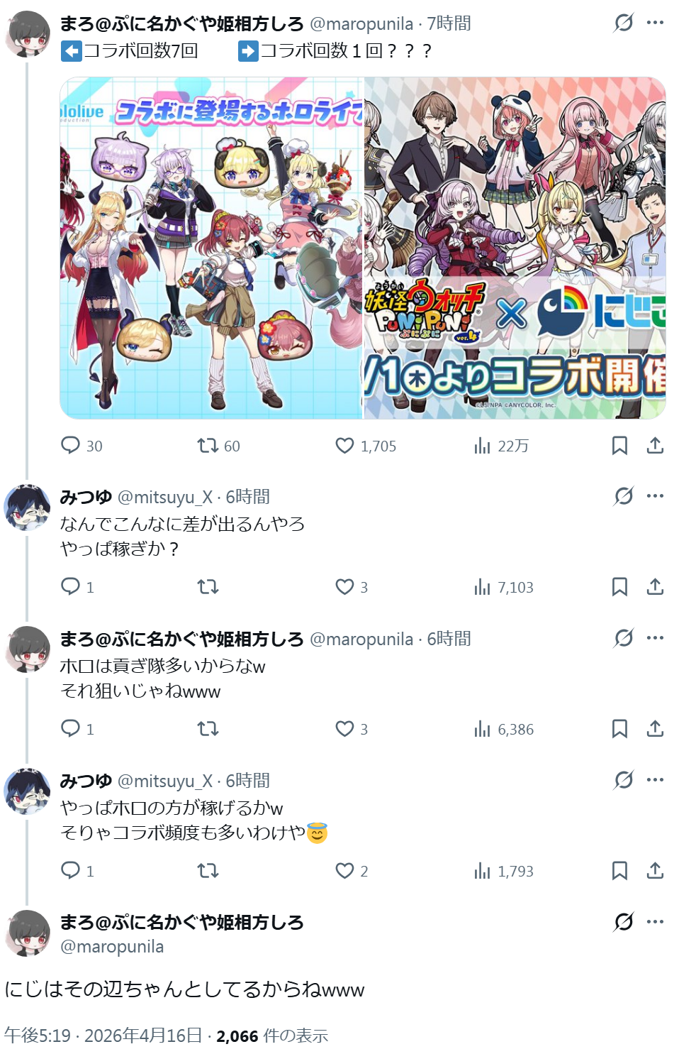 | … | 5026/04/18(土)00:28:51No.1421337337そうだねx5>これは理由が超単純で妖怪のにじコラボ売り上げがゴミカスだったんだよね |