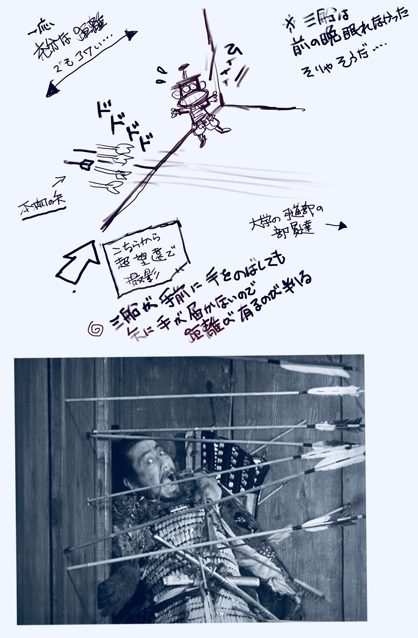 | … | 6526/04/18(土)06:06:02No.1421371469+>壁に刺さる矢は三船と弓手の距離が開けると矢の勢いが弱くて迫力がないし矢の逸れ幅が大きくなるから |