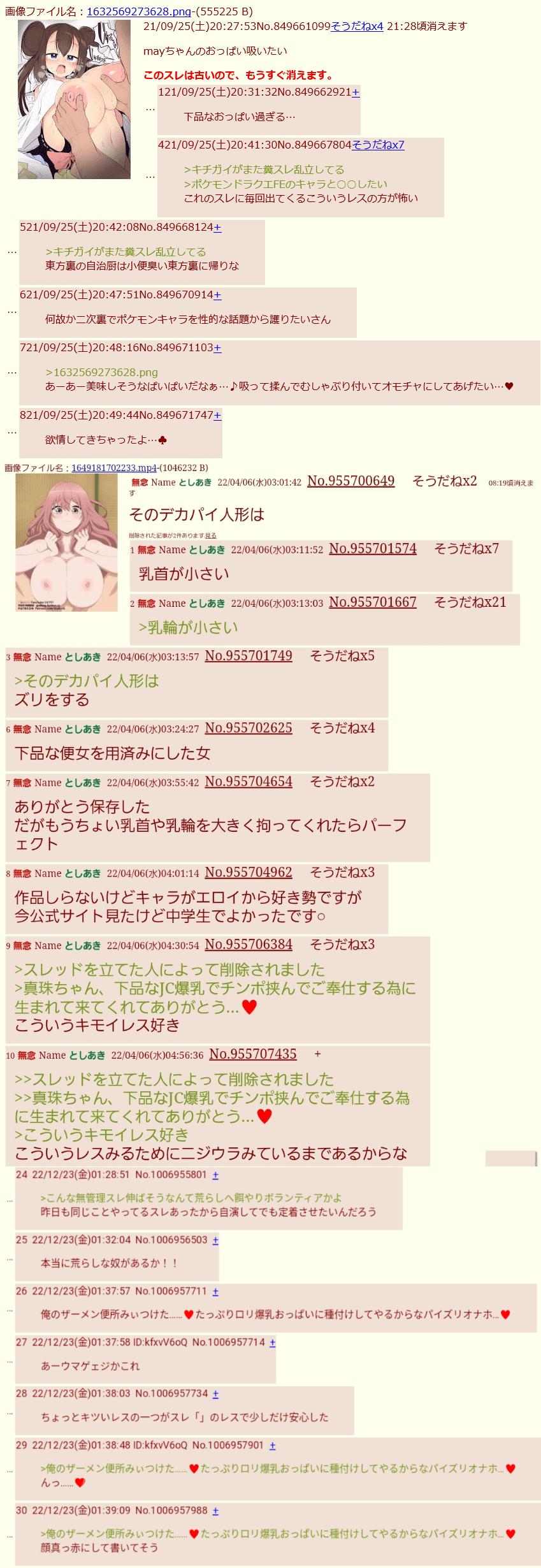 | … | 5226/04/18(土)14:27:28No.1421465919+>そういやいたなぁポケモンの女キャラで気持ち悪い壁打ちスレ乱立するキチガイ… |