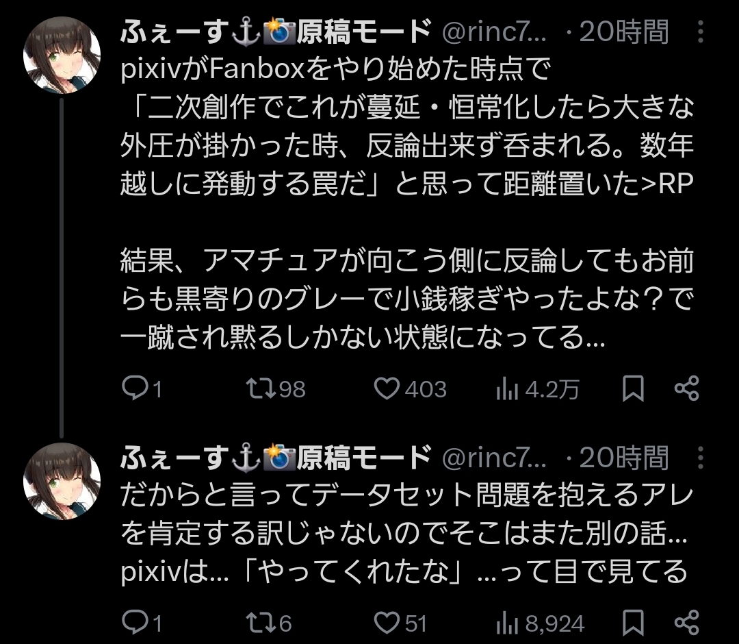 | … | 4926/04/18(土)13:34:46No.1421453339そうだねx7FANBOXとかで二次創作はどうなんだって指摘はAI以前にももちろんあったけど |