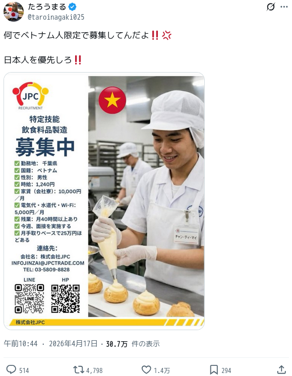 | … | 2726/04/18(土)16:58:49No.1421504667そうだねx2特定技能で募集してるんだから日本人じゃおかしいだろ…フィリピン人やネパール人も募集しろって怒るならわかるけど |