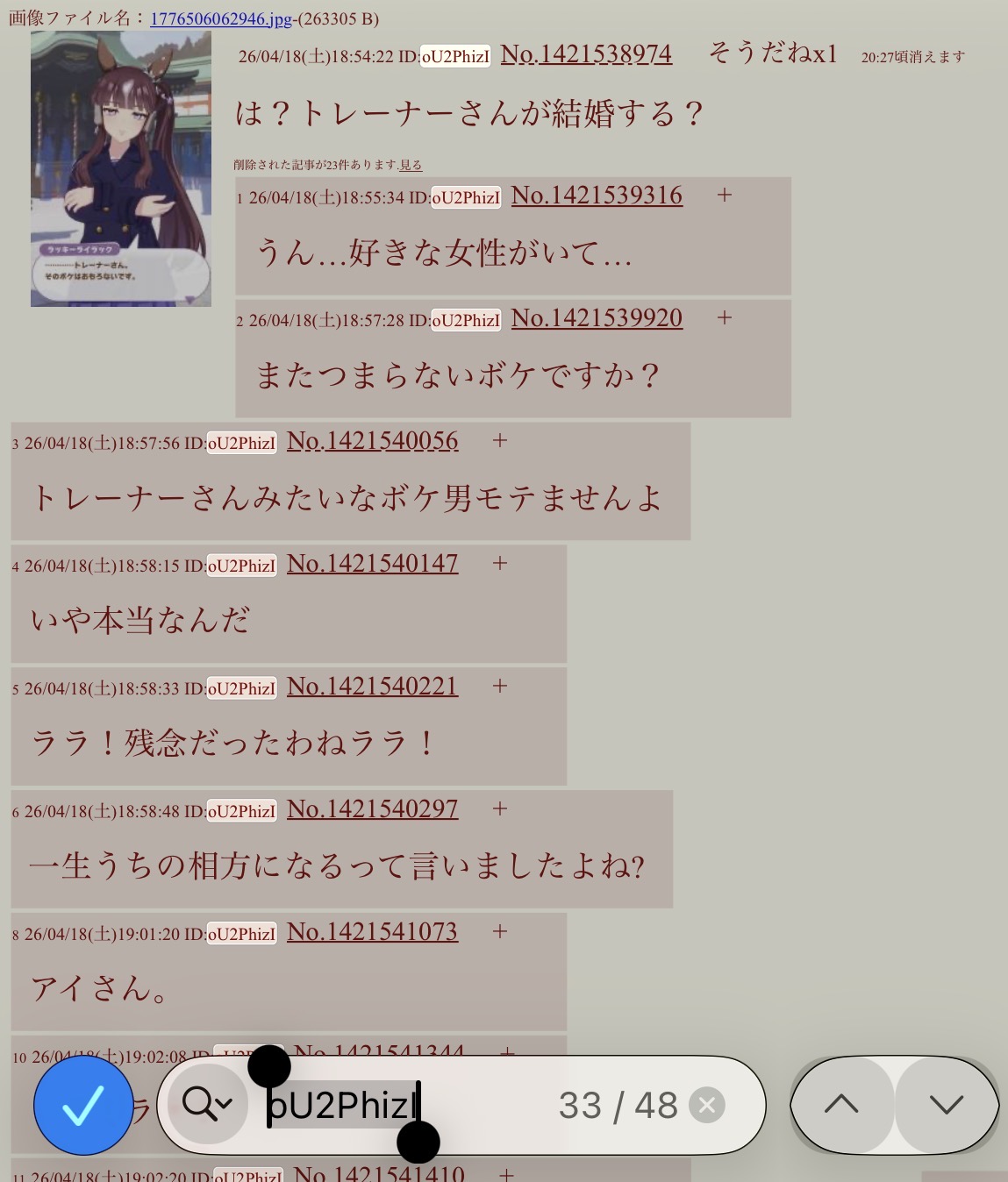 | … | 20026/04/18(土)20:24:39No.1421574863+>他に反応してくれる人がいる場所がどこにもないから… |