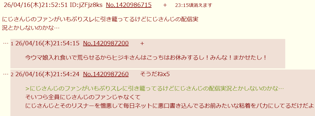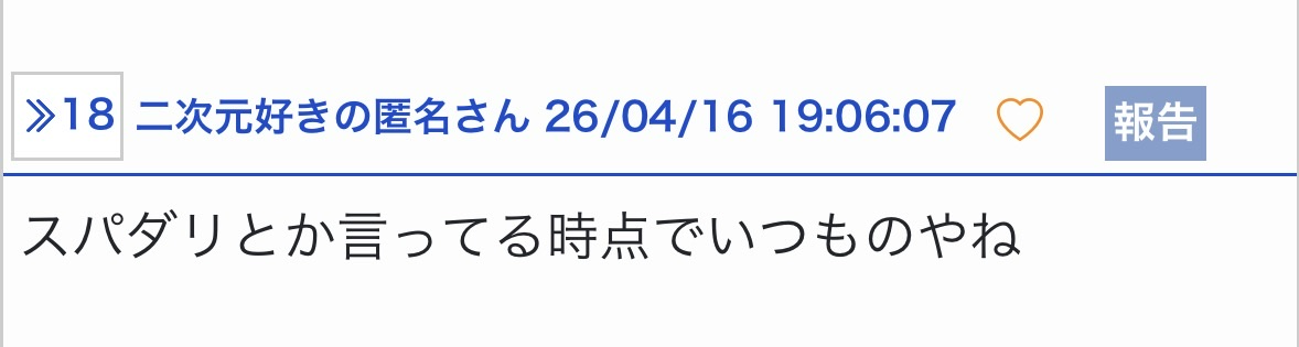 | … | 2026/04/18(土)19:41:05No.1421555908そうだねx3やりたいのは粘着だから別に乗ってもらいたいわけでもないのが凄い |