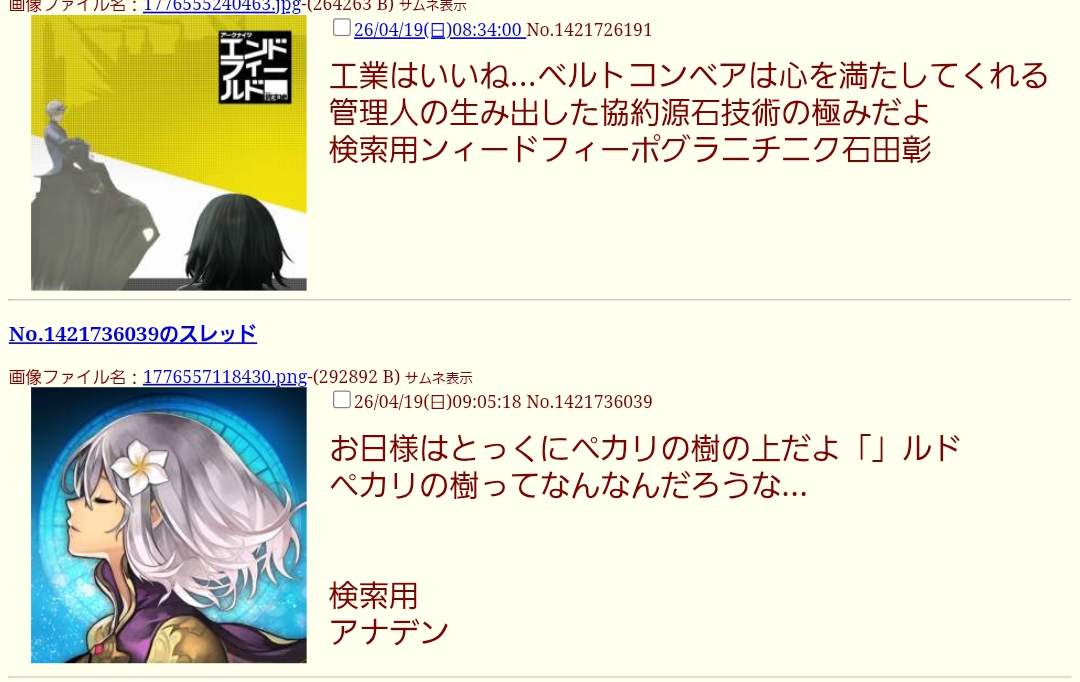 | … | 20426/04/19(日)11:14:23No.1421770227そうだねx2>管理放棄してありのままの流れを楽しむのがimg流だったんだがなあ |