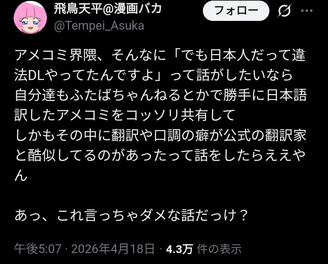 | … | 9726/04/19(日)11:12:44No.1421769832+よくわからんけどとしあきじゃなく公式の翻訳家が違法うpしてたってこと? |