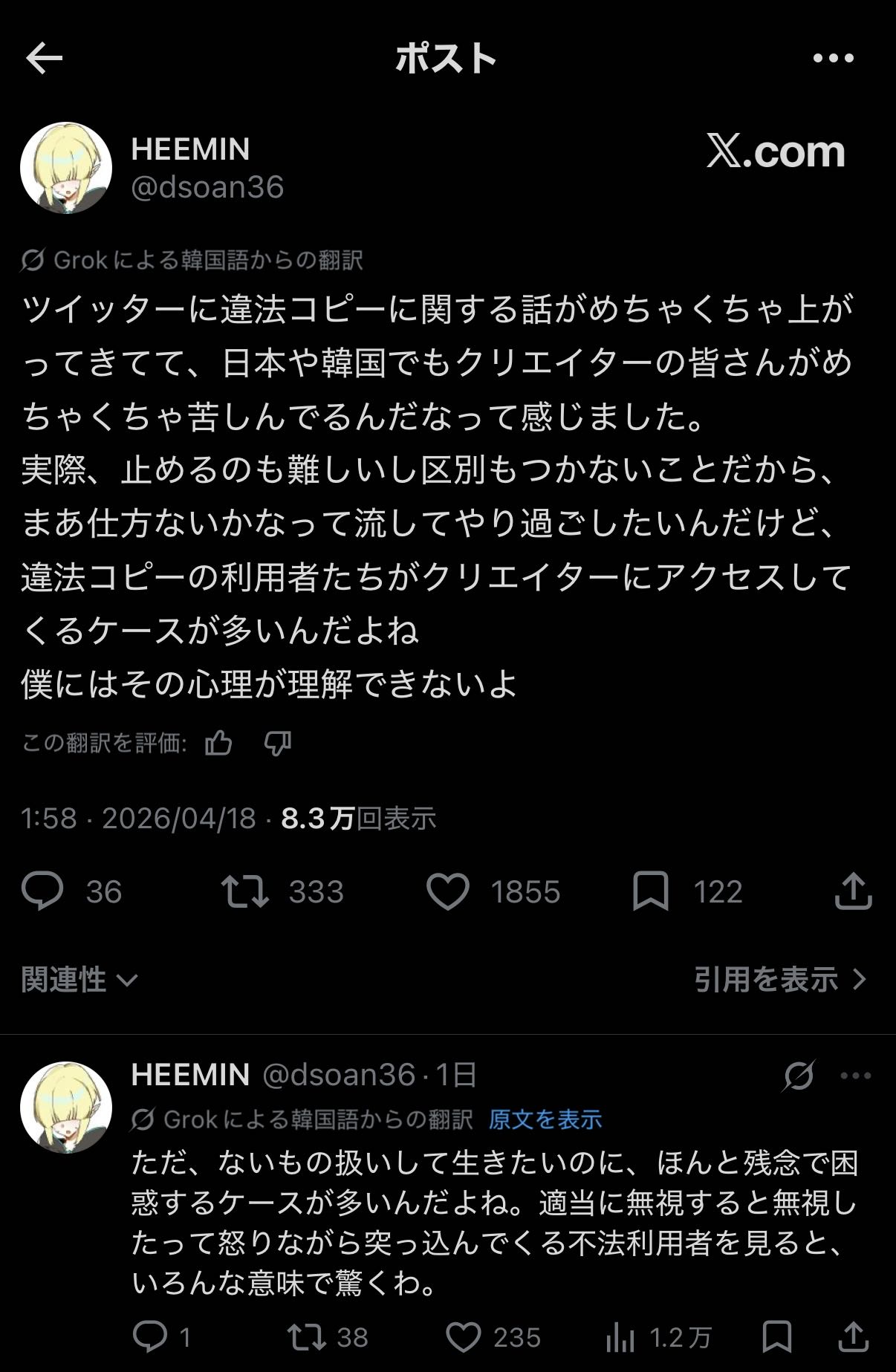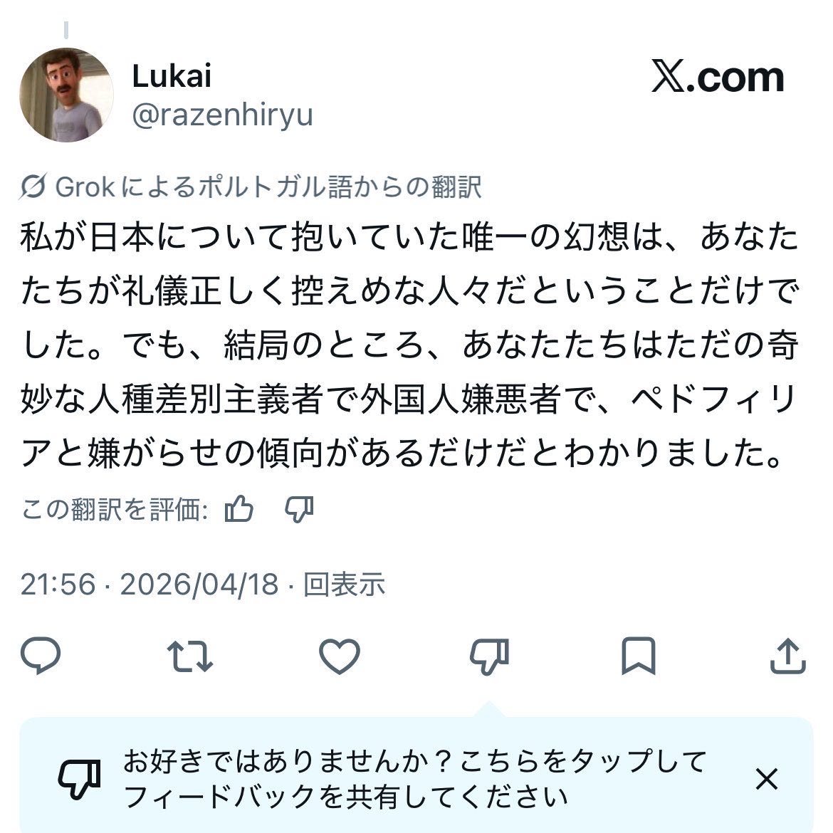| … | 37826/04/19(日)12:19:41No.1421787442+>日本人がTwitterの自動翻訳が実装されるまで海外でいくら割られようがどうせ気にしない見ようともしないだったんだから翻訳で可視化された途端利益がうんぬん言うなってのはすげぇわかる |
