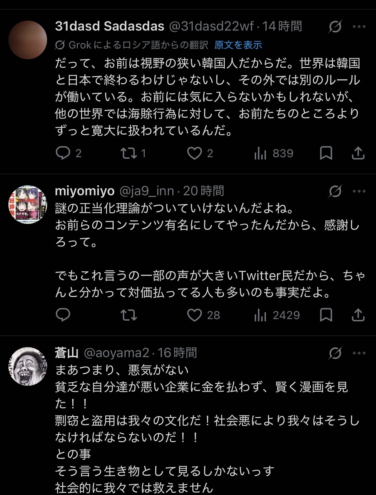 | … | 9626/04/19(日)11:12:23No.1421769758そうだねx7オタクくんは違法や剽窃平気でするけどまあまあ後ろ暗いことだとは思っているので理論武装しまくって |