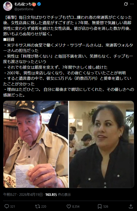 | … | 3026/04/19(日)12:51:28No.1421796508そうだねx1同じ額でもチップとして都度貰うのとこうやって遺贈で一括で貰うのとだと税制的にはどっちが良いんだろ |
