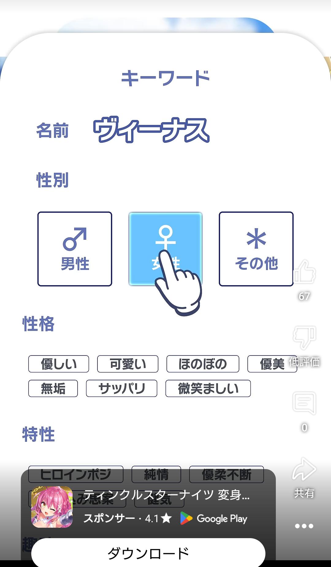 | … | 10826/04/19(日)23:08:50 ID:D41LKwNwNo.1422024202+>fu6572010.jpg 名前がヴィーナスって決まってるのに男性とか選ぶとどうなるんすかねこれ |