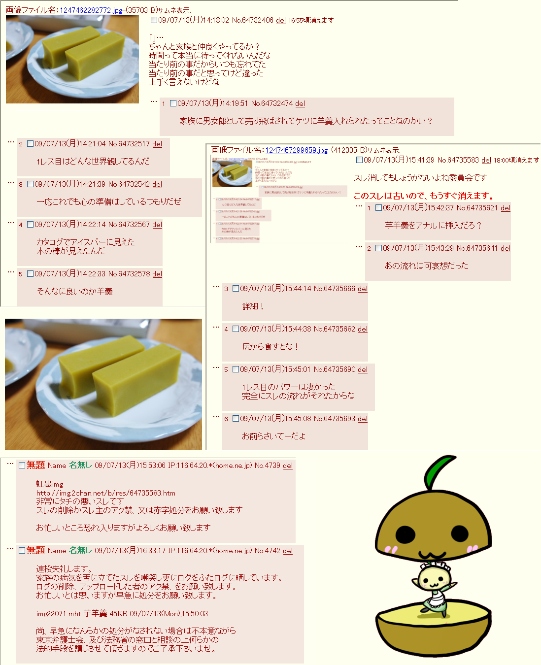 | … | 1826/04/19(日)22:23:22No.1422006373+>確かこのときまだ人数も少ないから田亀源五郎のケツに芋羊羹入れる漫画がimg全体で流行ってたからこうなった気がする |