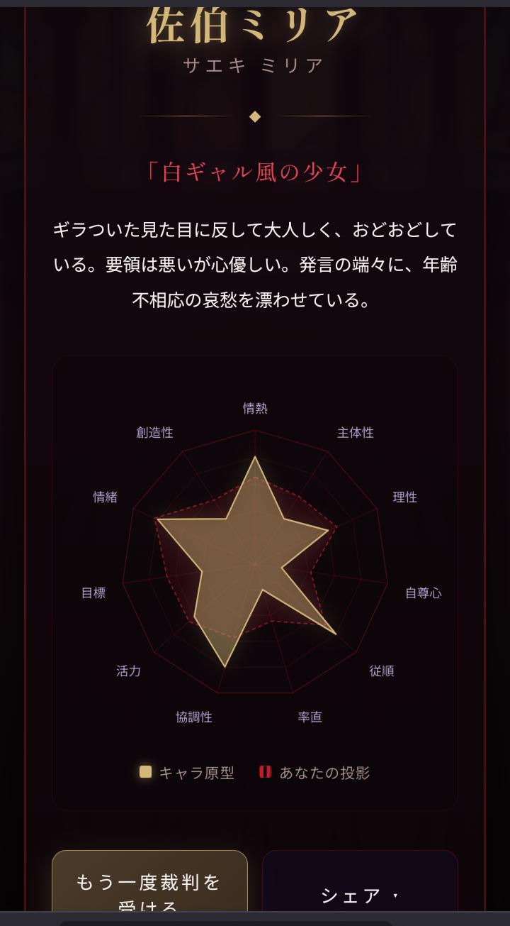 | … | 2426/04/19(日)23:05:43No.1422023046+自分に当てはまる択ねぇわ…って選んでったらノアちゃんだった |