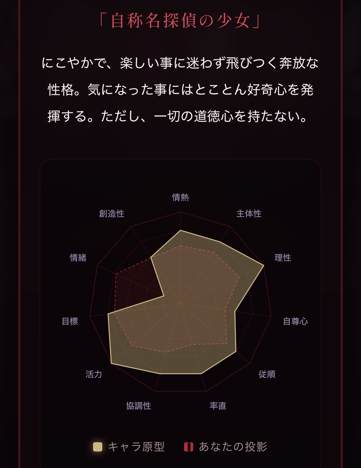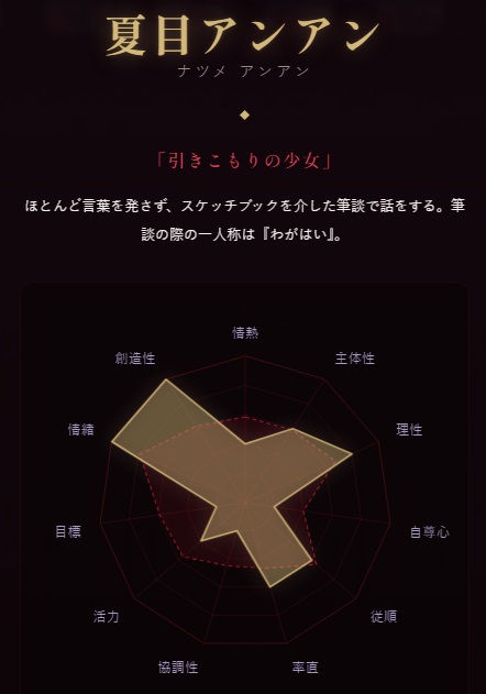 | … | 2326/04/19(日)23:05:34No.1422022990+「率直」って素直さ飾らなさの数値なのかなと思ったけどノアが意外と低いことに闇を感じた |