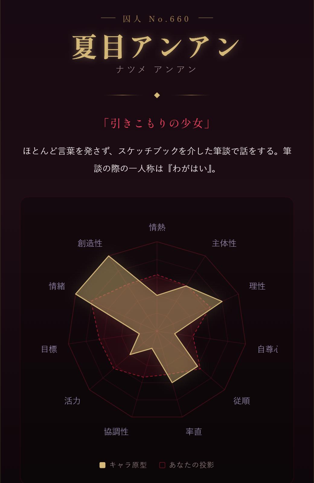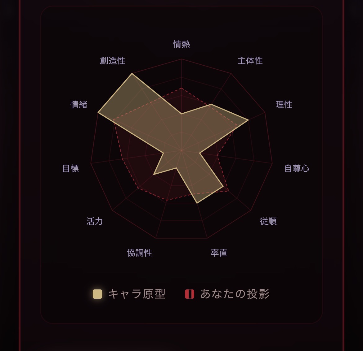 | … | 3026/04/19(日)23:11:24No.1422025098+ヒロちゃん情熱・率直・協調性が低くて創造性が最低値だけどそれ以外の数値高めってだいぶやべー奴だな… |