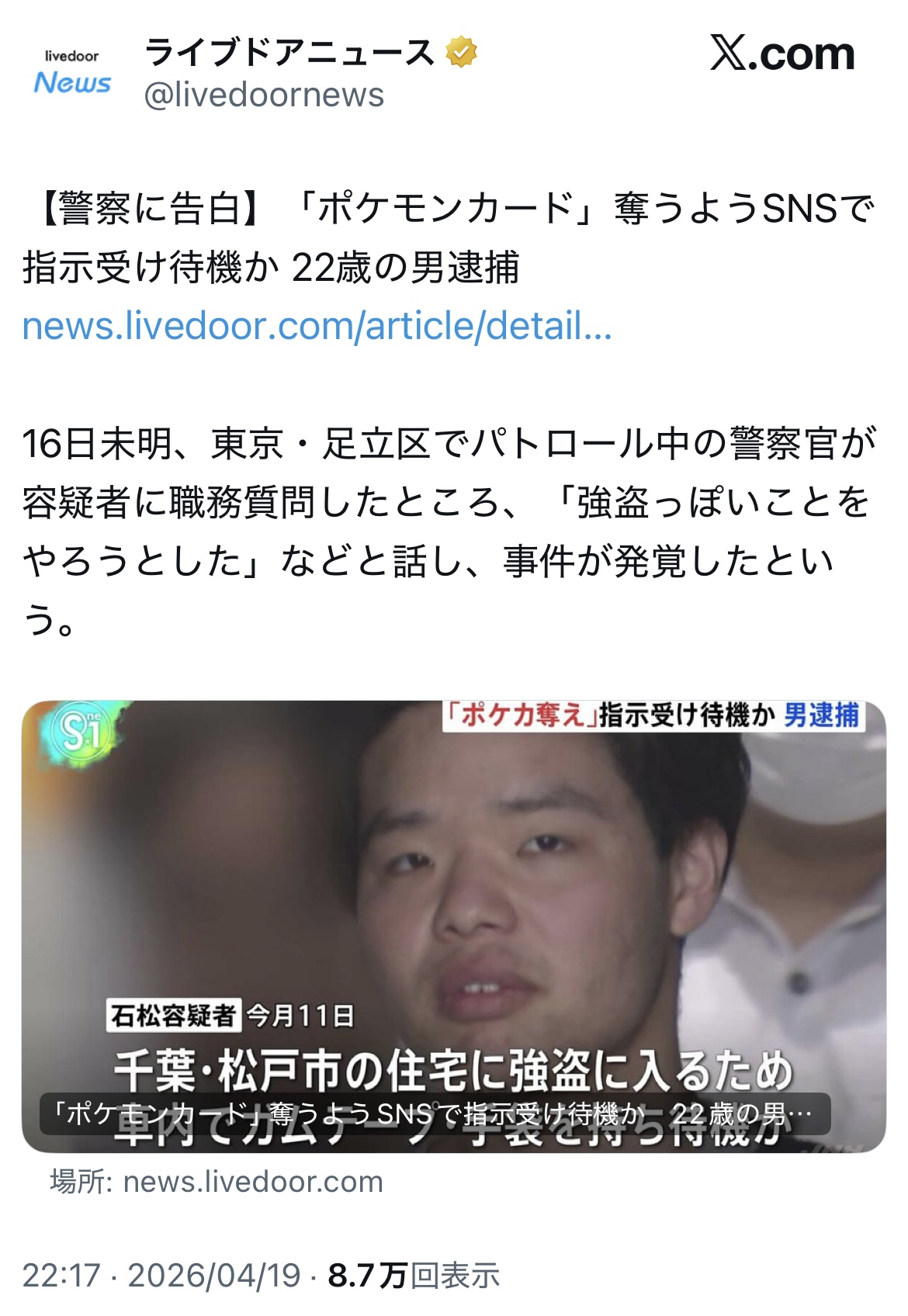 | … | 2326/04/19(日)23:12:48No.1422025591+> 取り調べに対し、石松容疑者は容疑を認めたうえで、「SNSで『関東ルパン案件』としてポケモンカードを奪うよう指示されるも直前に怖くなりその場を去った」といった趣旨の供述をしているということです。 |