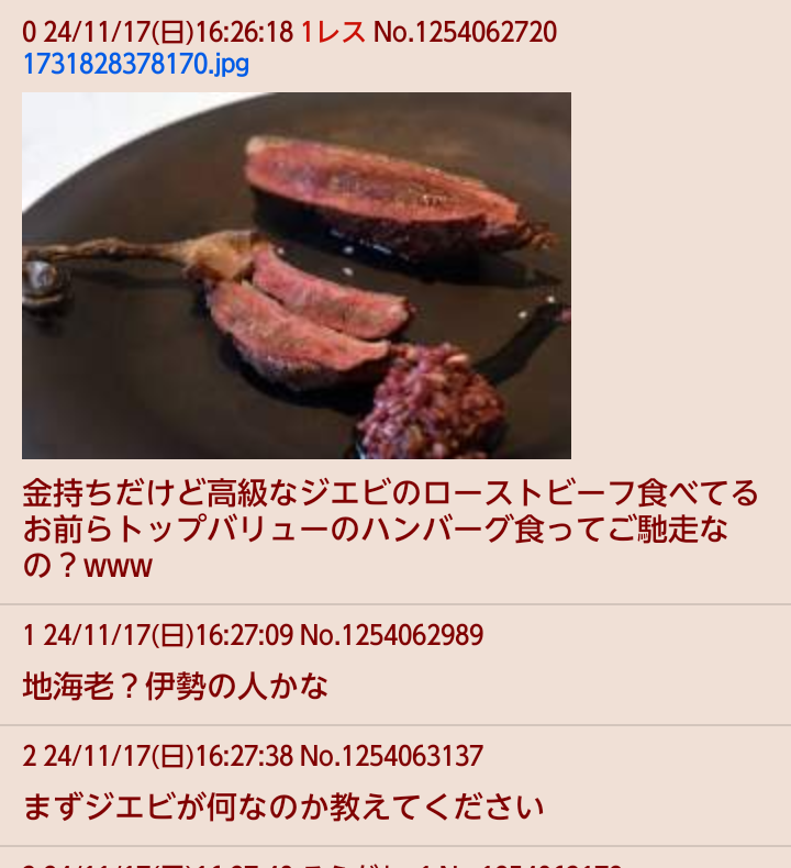| … | 3526/04/20(月)03:04:35No.1422075870そうだねx3仮にジビエのことだったとしてもローストビーフにならねえだろ |