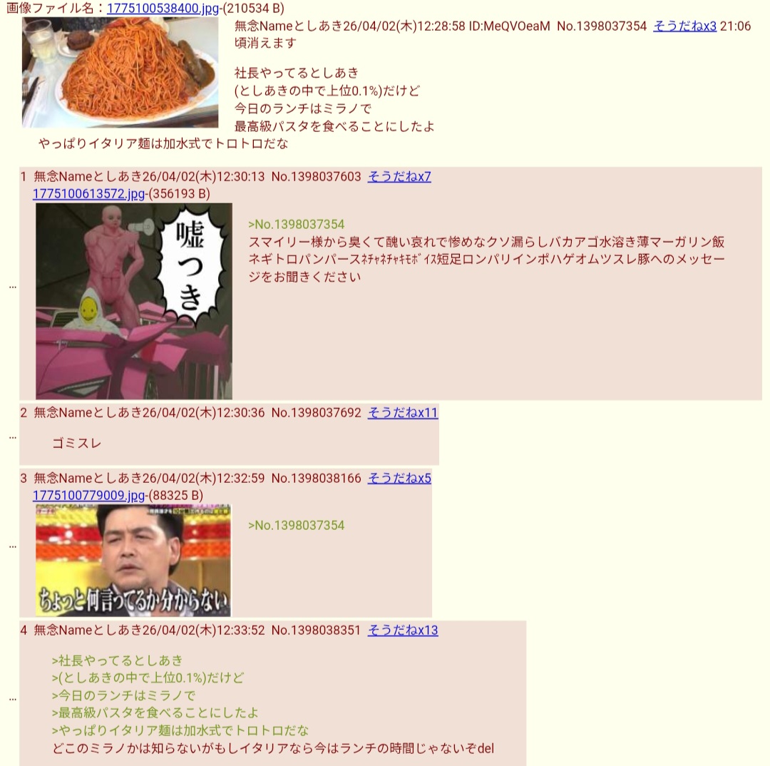 | … | 12026/04/20(月)07:32:52No.1422089829+実は飯画像以外の物も無断転載してる |
