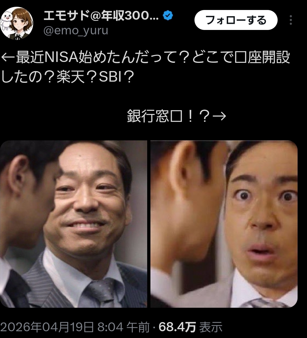 | … | 4526/04/20(月)08:02:55No.1422093005+会社やってるけど2年前くらいの地銀からのノルマがごときNISA営業が鬱陶しかった |