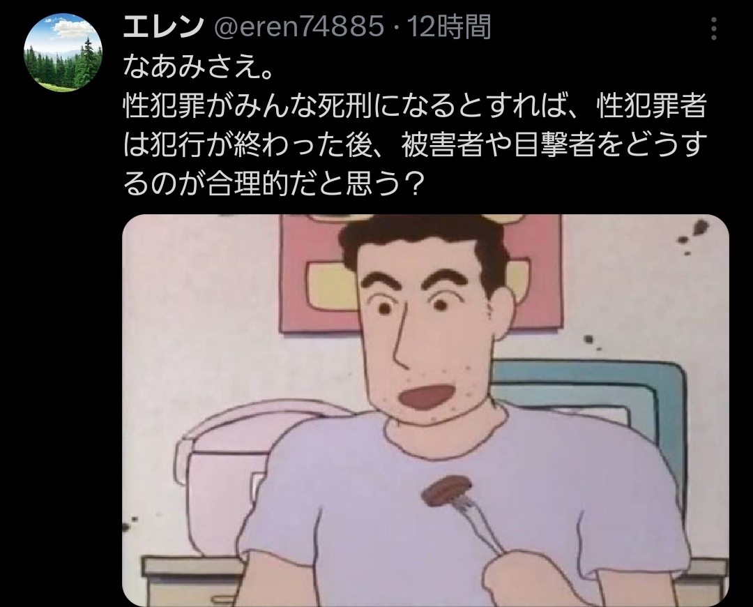 | … | 3326/04/20(月)07:57:57No.1422092424+死刑も恐れず性犯罪した挙句相手殺す奴の何に配慮しろってんだよ |