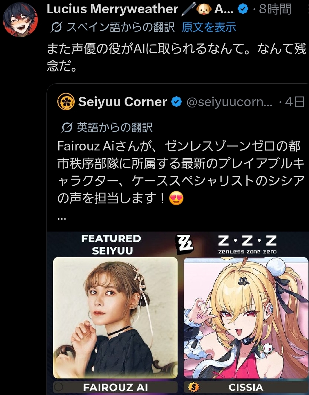 | … | 2026/04/20(月)09:54:49No.1422108970そうだねx9Fairouz Aiって名前をポンと出されなら人間の声優の名前だろうとはなかなか思えなさそう |