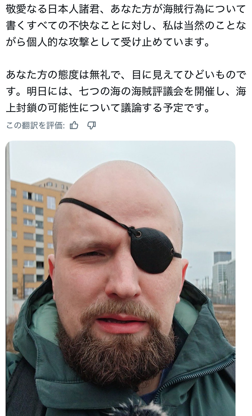 | … | 86026/04/20(月)12:46:11No.1422144443+>海賊行為やめろって言ったら差別だって言い出す奴は普通に嫌い |