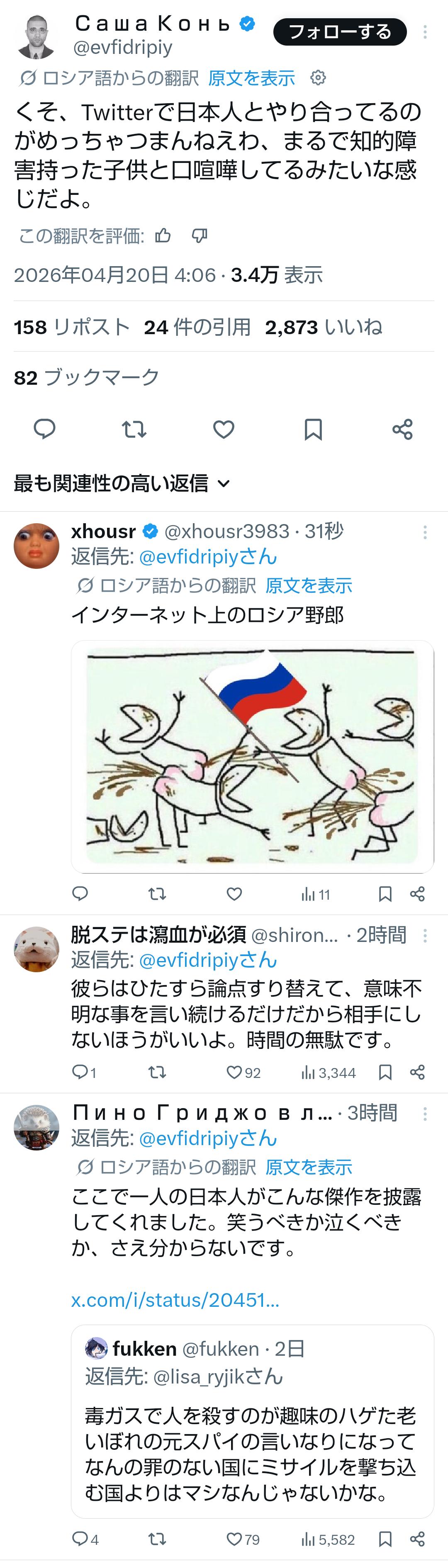 | … | 5726/04/20(月)11:15:57No.1422122666そうだねx2海の外にも同レベの程度の低いアホがいるんだなと実感した |