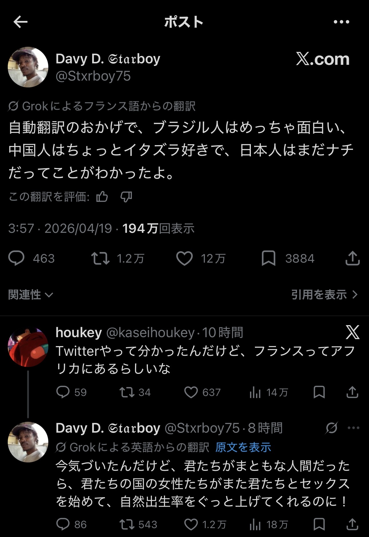 | … | 326/04/20(月)10:51:57 ID:lGKLglh6No.1422118296そうだねx42日本人の素朴な差別意識が世界中に拡散されてしまった… |