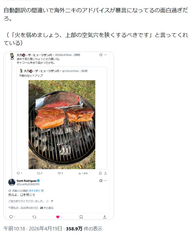 | … | 1026/04/20(月)10:58:37 ID:lGKLglh6No.1422119532そうだねx2BBQで和気藹々としてたのは前菜でしたね |