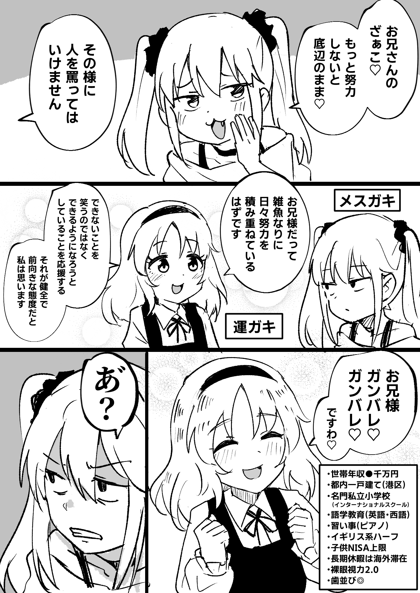 | … | 526/04/20(月)15:26:05No.1422177071そうだねx3結局メスガキもお兄さんと同じくらいの底辺層なんだよな |