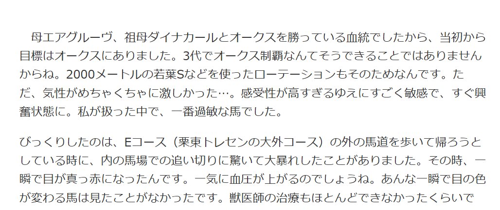 | … | 16326/04/20(月)23:01:05No.1422316925そうだねx1>ジャパン君はレディさんと運命的な出会いで今の性格になるまで現役時代から薔薇親父に来た当初は滅茶苦茶危険な馬だったのよ |