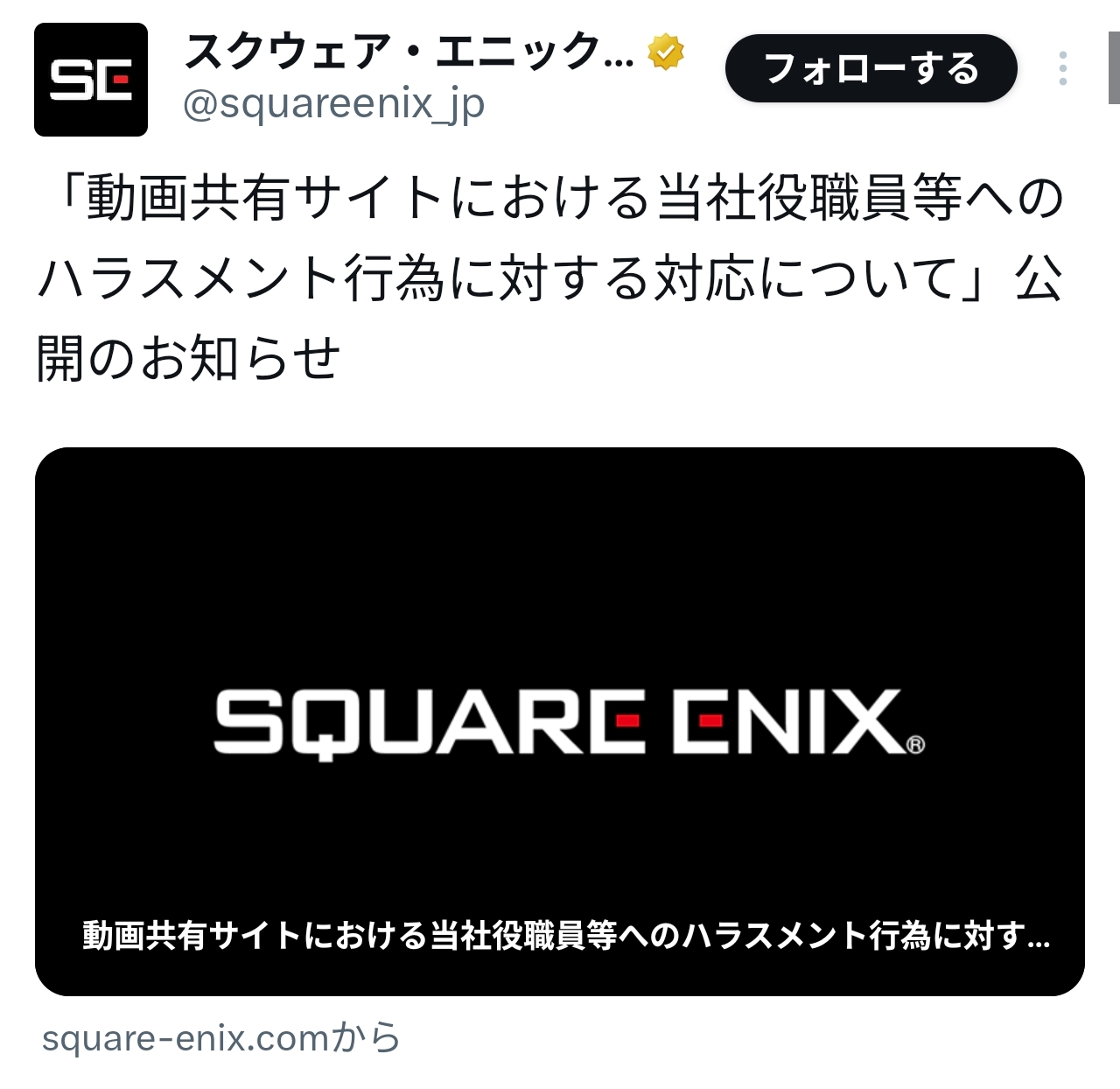 | … | 4126/04/20(月)23:49:05No.1422332269そうだねx1>動画を動画共有サイトで公開した投稿者を特定し、当該投稿者からの謝罪と解決金の支払い、ならびに今後の類似行為の禁止を含む和解に至ったことをご報告いたします。 |