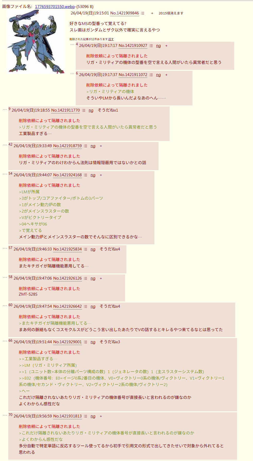 | … | 7126/04/20(月)23:20:29No.1422323357そうだねx9相変わらずF91はガンダムネタで騒ぐ子来てるけど浮いてるよ |