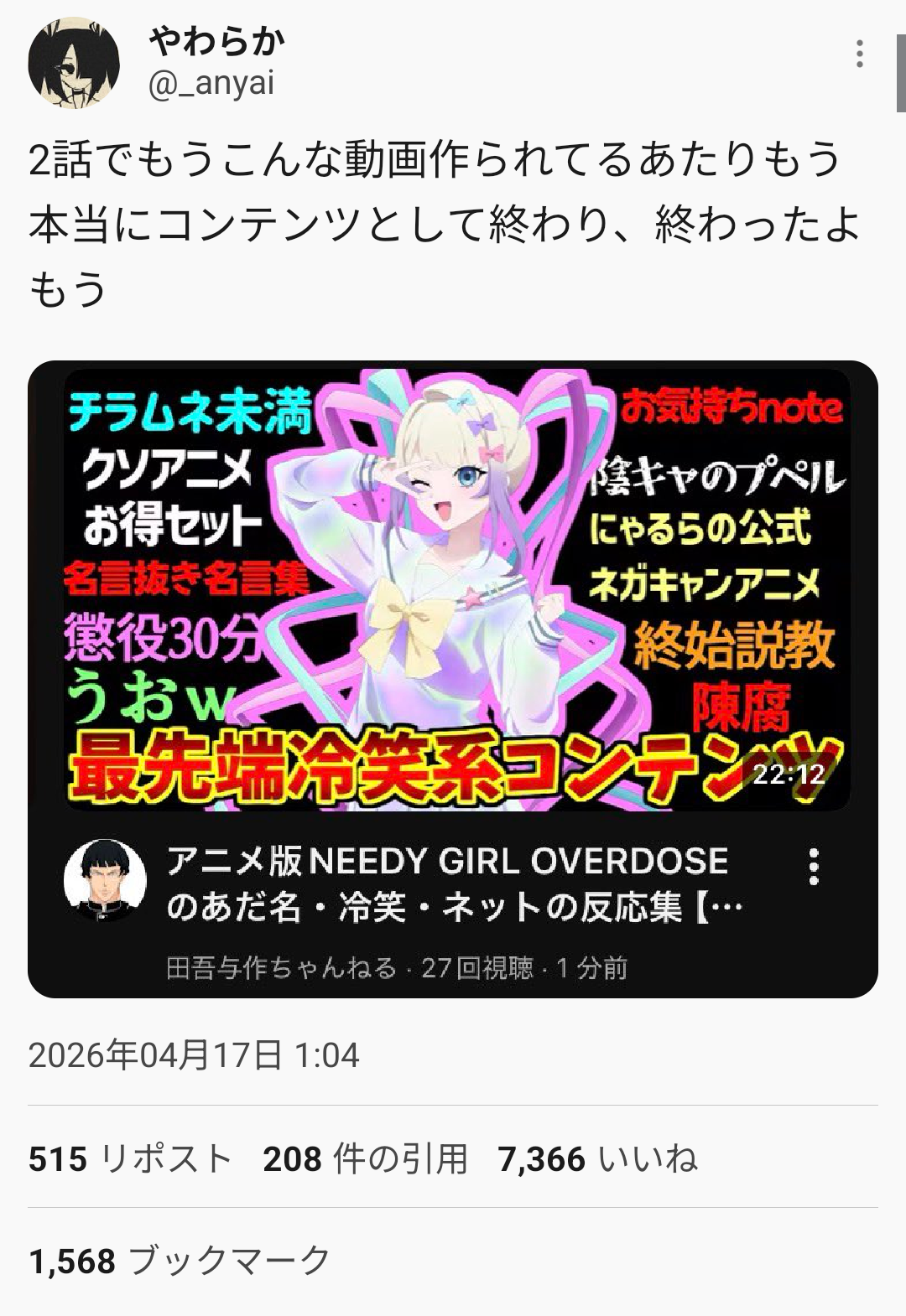 | … | 626/04/21(火)07:01:45No.1422373529そうだねx24匿名掲示板で拾ってきた胡乱なレスを垂れ流すだけの動画のサムネを匿名掲示板に貼ってレスを収集するという永久機関 |