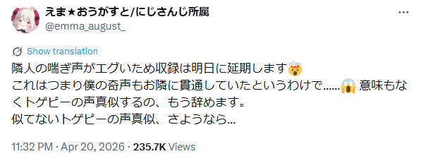 | … | 3726/04/21(火)07:40:13 ID:MTS9hD3wNo.1422376526そうだねx11配信頻度高い企業配信者が防音室無しで活動してるのテロじゃね |