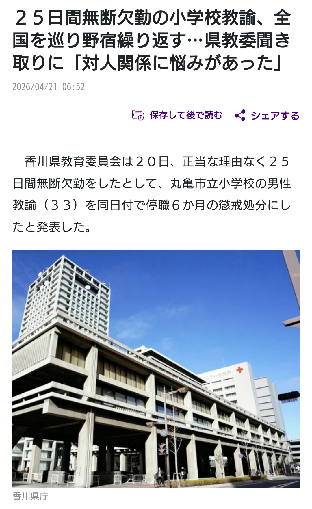 | … | 3026/04/21(火)17:29:36No.1422490525+>>停職6か月は懲戒免職の次に重い処分だし実質クビ宣告だよね |