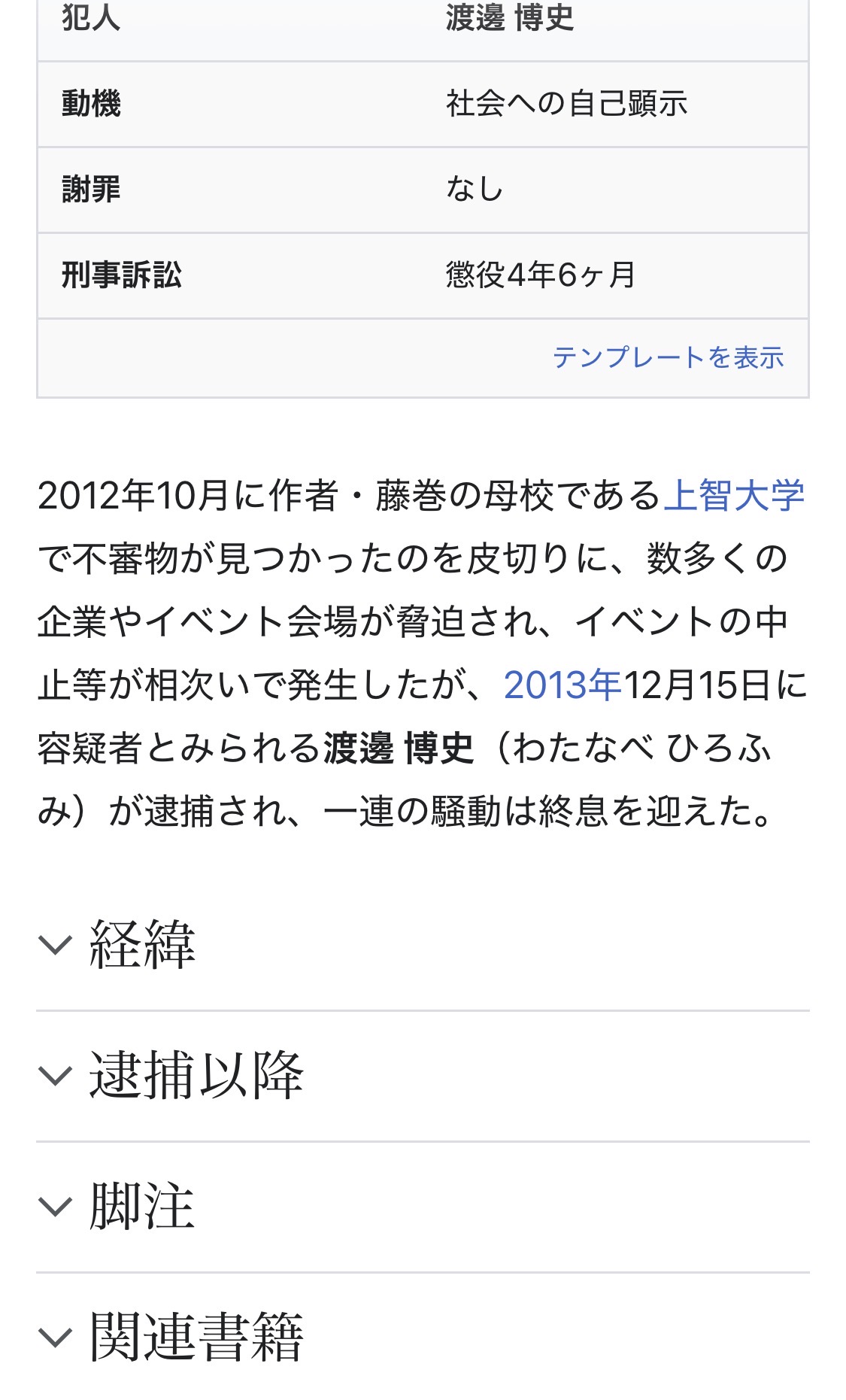 | … | 6826/04/21(火)19:38:09No.1422528318+wikipediaで記事化されるレベルの事件はその時点で実名載ってよさそうなもんだが |