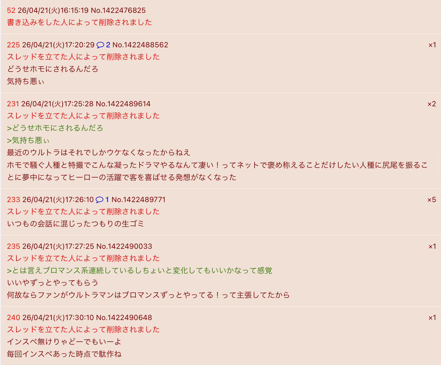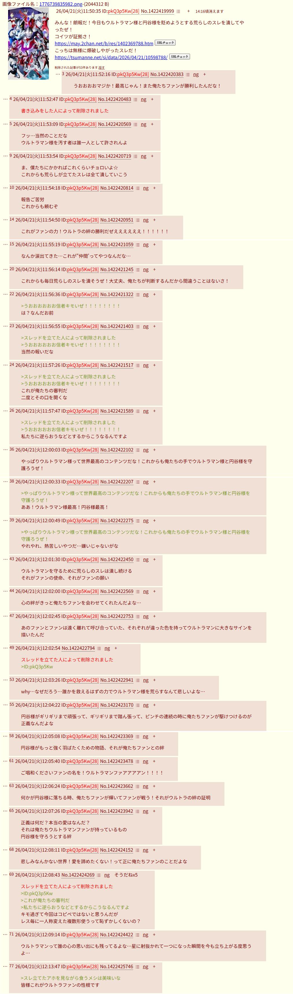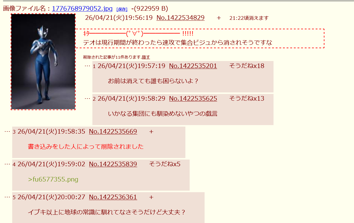 | … | 326/04/21(火)19:58:35No.1422535669+書き込みをした人によって削除されました |