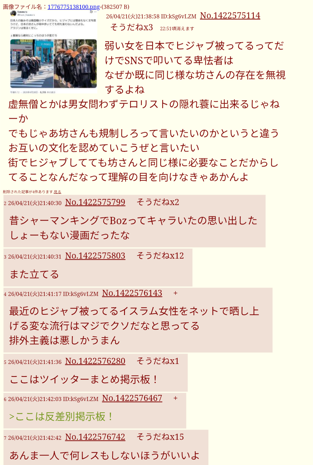 | … | 7526/04/21(火)22:23:14No.1422593078そうだねx1袈裟まで憎むのが日本しぐさだからヒジャブを憎むのも古き良きキチガイなのでは? |
