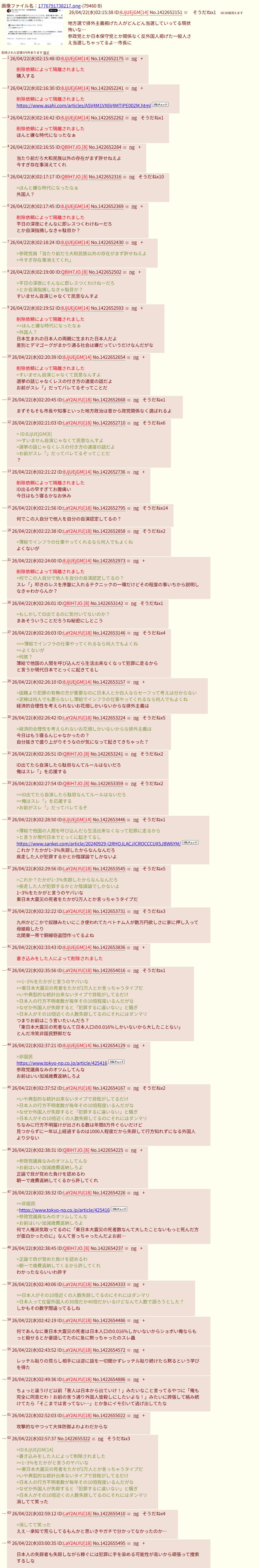 | … | 426/04/22(水)02:16:55 ID:QBlH7JO.No.1422652284+当たり前だろ大和民族以外の存在がまず許せねえよ |