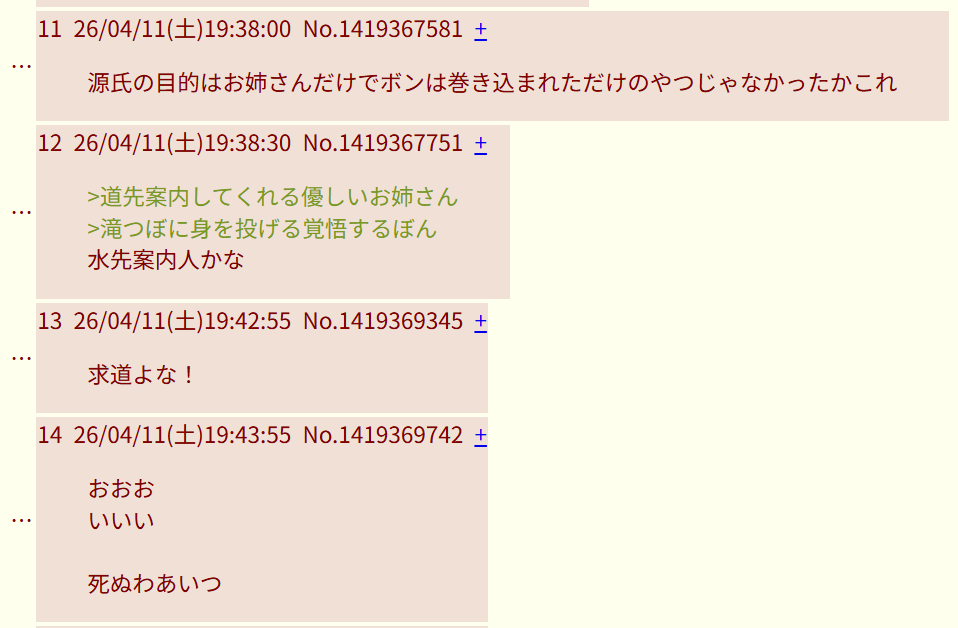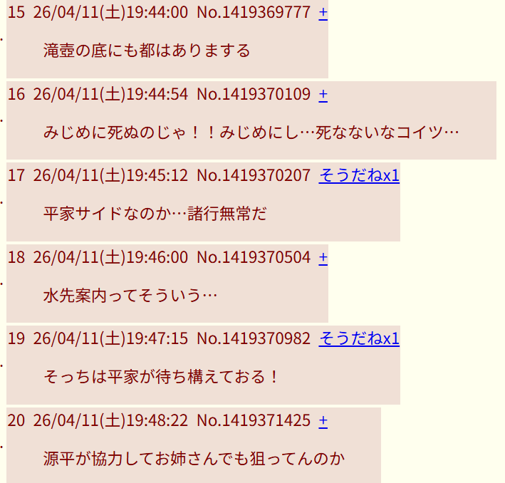 | … | 4026/04/22(水)05:04:27No.1422659936そうだねx6源平が協力してお姉さんでも狙ってんのか |