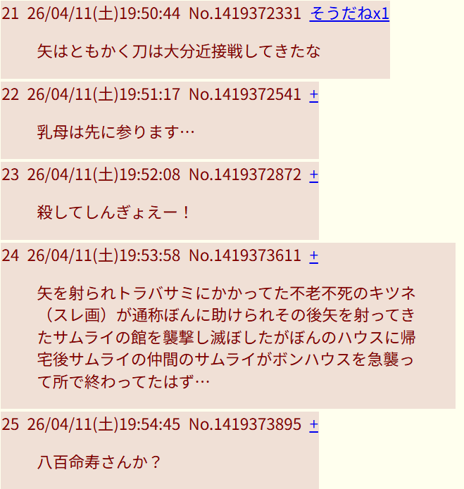 | … | 6526/04/22(水)06:00:39No.1422661524そうだねx6>おのれあやかしめが…南八幡大菩薩…! |