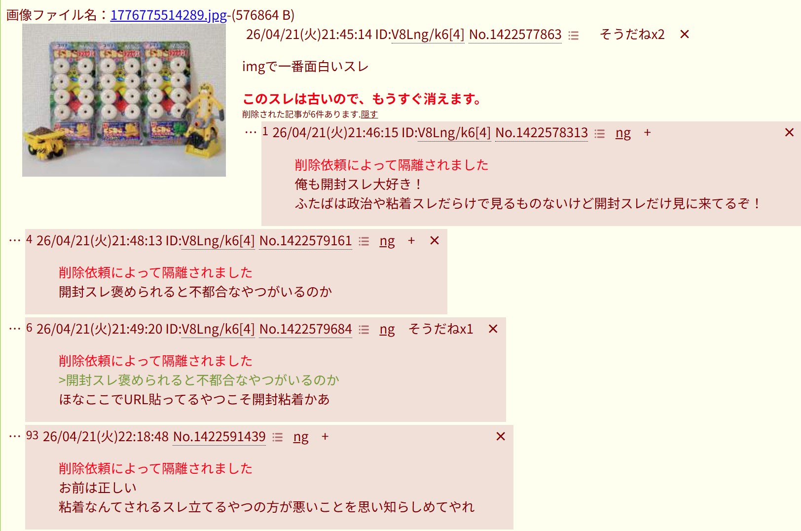 | … | 1526/04/22(水)04:12:12No.1422658519そうだねx5今日は開封粘着やんないの? |