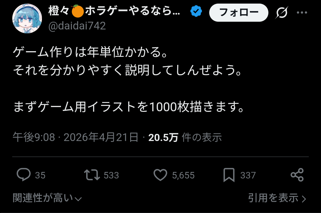 | … | 2226/04/22(水)06:53:10No.1422663904+>>>ちなみに画像の人はホラゲ作ろうぜって集まったメンバー全員消えて一人で全部やることになった |