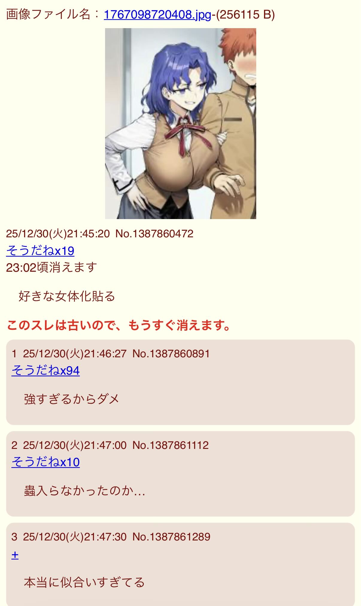 | … | 10126/04/22(水)13:43:57No.1422741250+令和最新版って自分から名乗ってるAI乱立してる荒らしが何度もTSワカメのスレ建てて暴れてるから多分これもそいつの建てたスレだと思うけど |