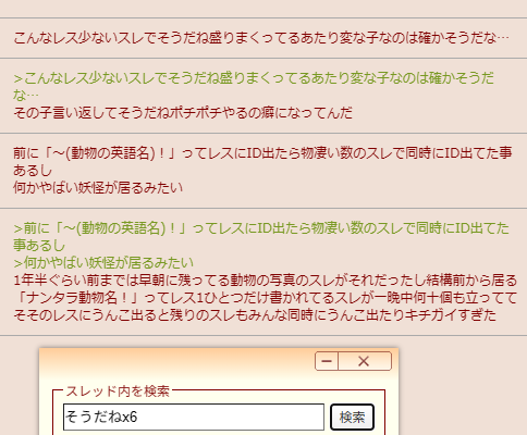 | … | 3526/04/22(水)15:25:26No.1422763442そうだねx6前に「〜(動物の英語名)!」ってレスにID出たら物凄い数のスレで同時にID出てた事あるし |
