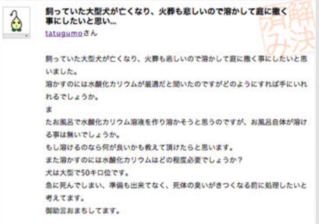 | … | 20226/04/22(水)16:31:17No.1422776049+>遺体を消す方法で質問してるのが話題になったのは知恵袋だったか2chだったか |