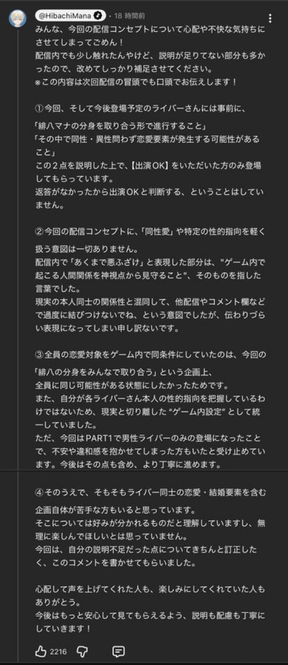 | … | 2826/04/22(水)16:35:40No.1422776817+>男性ライバーのみ登場って男同士の恋愛したら解釈不一致でママがキレたのかよ |