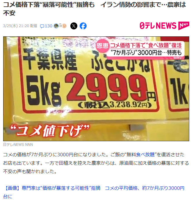 | … | 12626/04/22(水)17:42:34No.1422790878そうだねx9米騒動無くても今5kg3000円になっててもおかしく無いのかなとは思う |