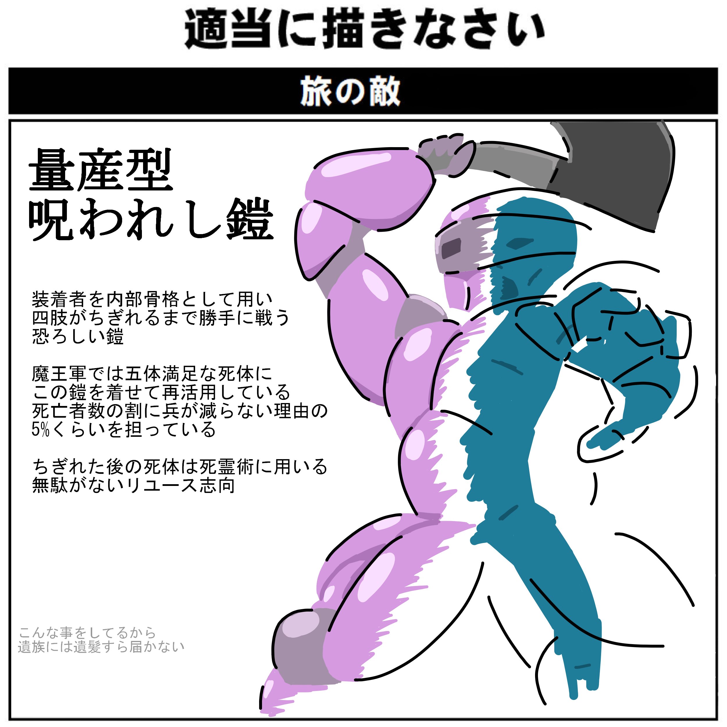 | … | 2626/04/22(水)21:53:20No.1422878030+>>>>もうさいちいち死体拾ってきて鎧被せるってのが面倒だしさ |