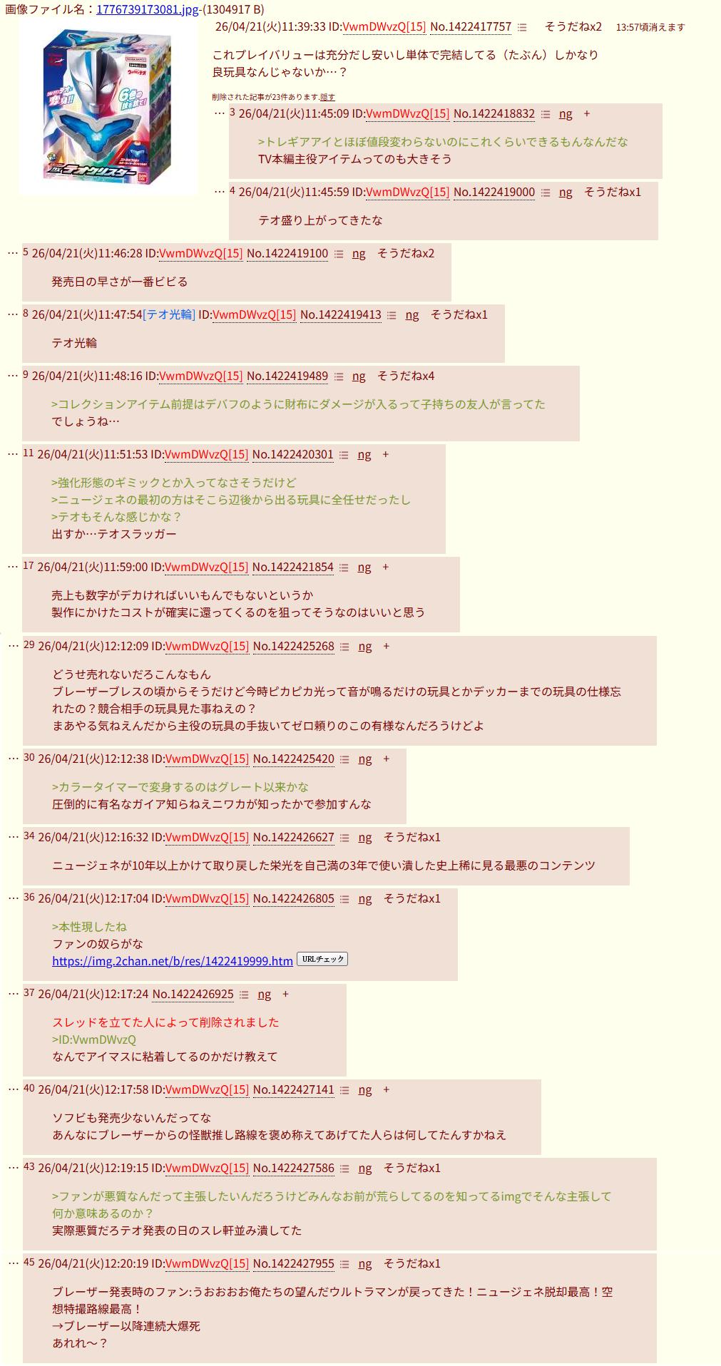 | … | 18626/04/22(水)21:37:27No.1422871784そうだねx3>他は荒せるからやってるけどウルトラ関係はマジで執着してる感じがある |