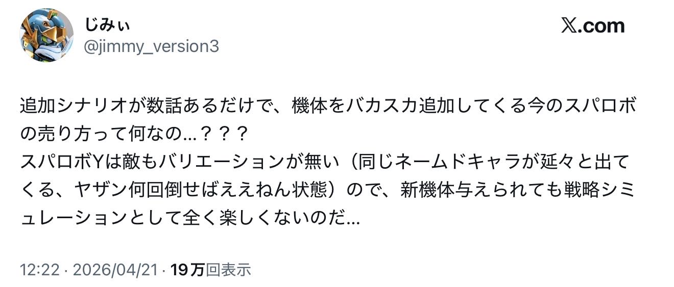 | … | 926/04/23(木)00:27:41No.1422933741そうだねx7戦略シミュレーションだった時代なんてウィンキースパロボの時代まででしょ… |